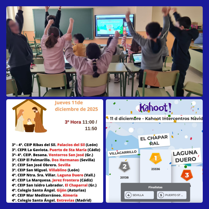 Se realizan dos Kahoot Intercentros, uno a finales del primer trimestre para 5º y 6º de Primaria con temática Navideña y el otro al final del segundo trimestre para 3º y 4º de Primaria con temática de Semana Santa.