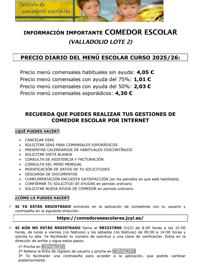 Me es grato comunicarles que se va a producir en Valladolid capital y en su provincia la salida de la aplicación de comedor escolar a Internet. Esta salida abre la posibilidad de que las familias puedan realizar directamente diversas gestiones relacionadas con el comedor de sus hijos a través de la aplicación informática de comedores escolares creada a tal fin.